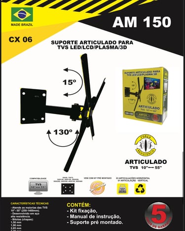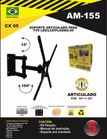 Suporte de TV articulado para TVs LED, LCD e Plasma de 10” a 55”, suportando até 40kg. Instalação fácil, resistente e ideal para qualquer ambiente.