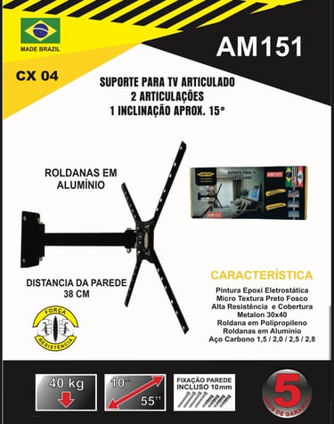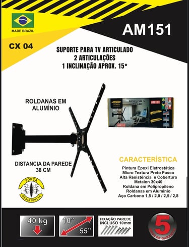 Suporte articulado com 2 articulações e inclinação de aproximadamente 15°, suporta TVs de até 40kg. Praticidade, resistência e ajuste ideal para seu ambiente.